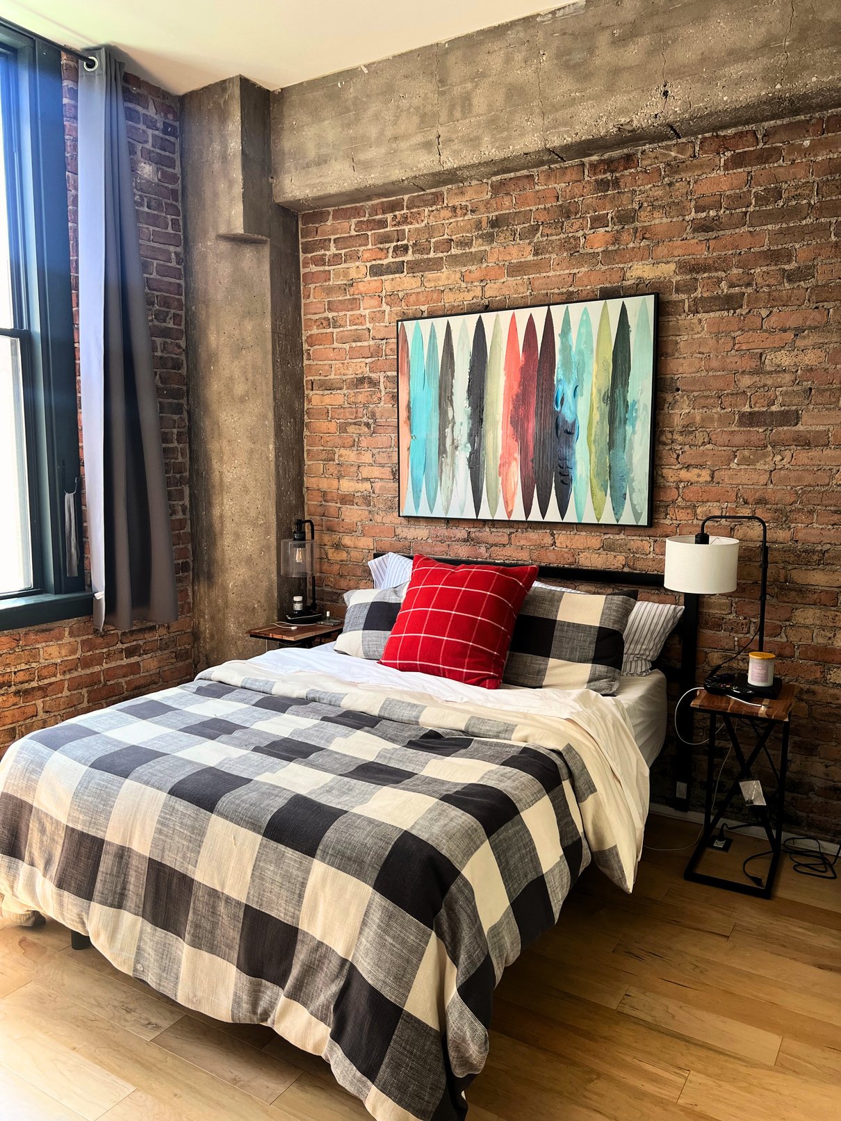 Unwind in the cozy bedroom furnished with a plush queen-sized bed and soft linens, ensuring a restful night's sleep after a day of exploring the city.